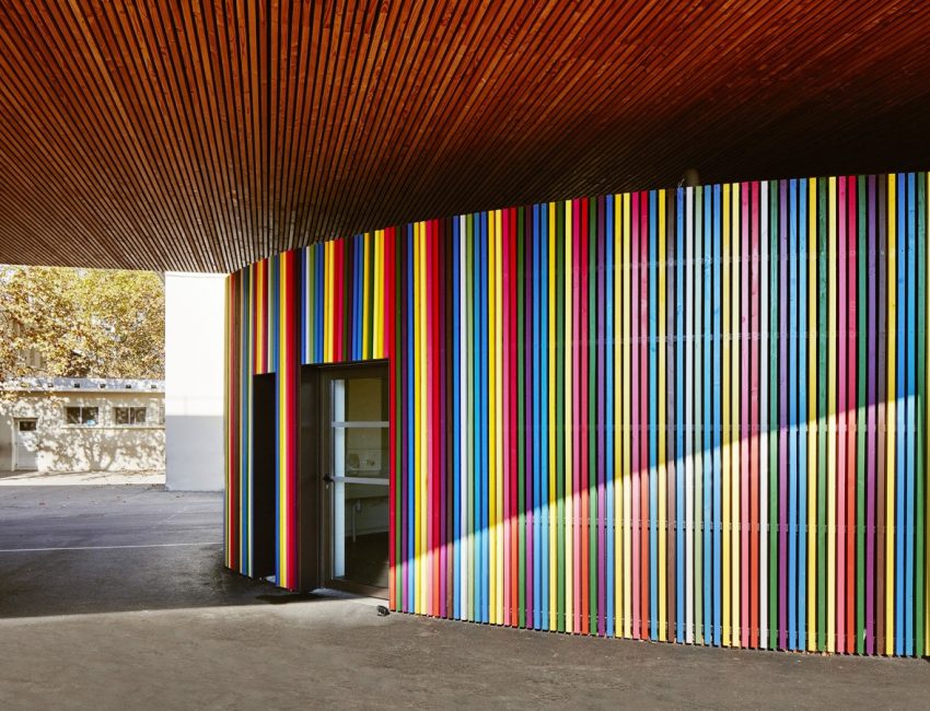 Le nouveau groupe scolaire Berthelot à Villeurbanne propose un bâtiment-pont construit entièrement en bois. C’est la pièce maîtresse de cette requalification, qui accueille des salles et une bibliothèque et fait la liaison entre le bâtiment existant et la construction neuve. Cette extension en superstructure libère le sol pour la cour et optimise les parcours intérieurs.